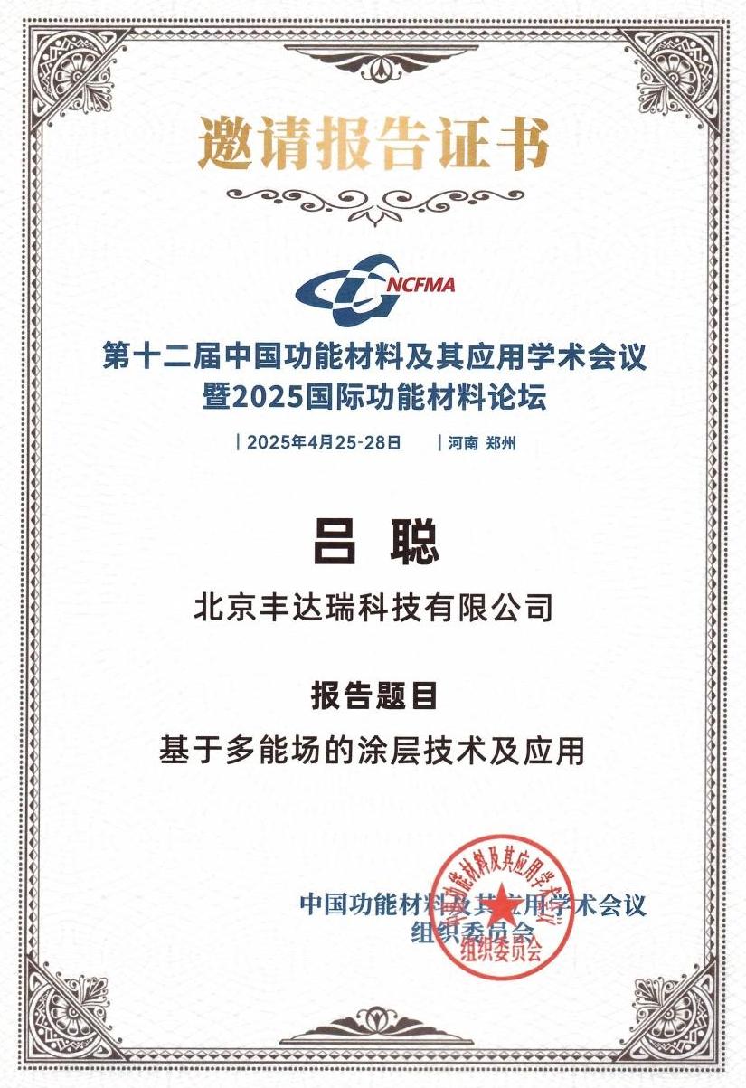 中国·郑州,2025年4月26日——在近日召开的中国第十二届功能材料及其应用学术会议暨2025国际功能材料论坛上,公司董事长吕聪博士作为特邀嘉宾出席,并在分会场作题为《基于多能场的涂层技术及应用》的专题报告。此次会议吸引了来自全球10多个国家和地区的1000余名材料科学领域专家学者、企业代表参会,共同探讨功能材料领域的技术突破与产业变革。